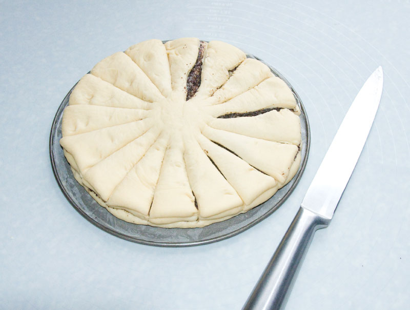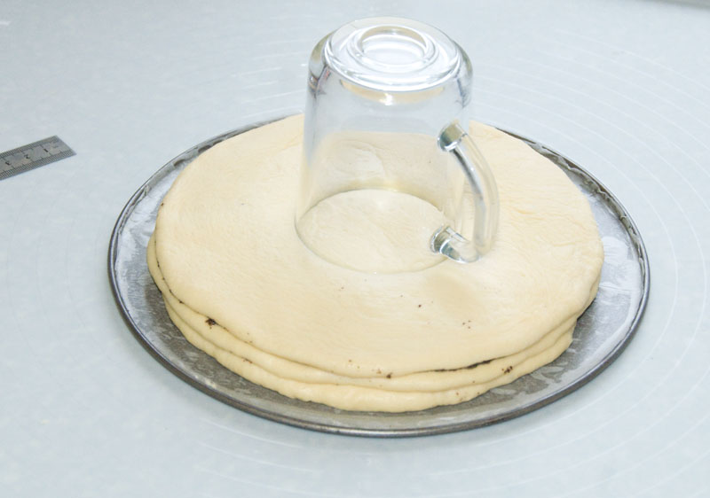 Za pomocą odwróconej szklanki zaznacz okrąg na środku stosu krążków drożdżowych.  Wystarczy lekko nacisnąć szklankę, aby ją odcisnąć. Jeśli posiadasz użyj podstawki do ciasta na odwrocie z tym przeznaczeniem, odciska za razem 16 części na każdym cieście i torcie. (patrz foto) Teraz za pomocą noża wytnij według tych odciśniętych promieni   kawałki ciasta, liczbę parzystą, na przykład 16. Nie przecinaj do samego środka, tylko zatrzymaj się na linii koła.  Segmenty powinny zatem nadal być przymocowane do okręgu po środku.  Aby segmenty były tej samej wielkości, a nie masz takiego znacznika jak na zdjęciu,  najlepiej najpierw wyciąć ćwiartki, a następnie jeszcze dwukrotnie podzielić je na pół.