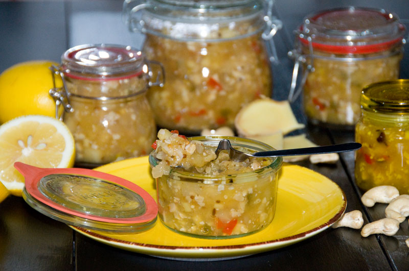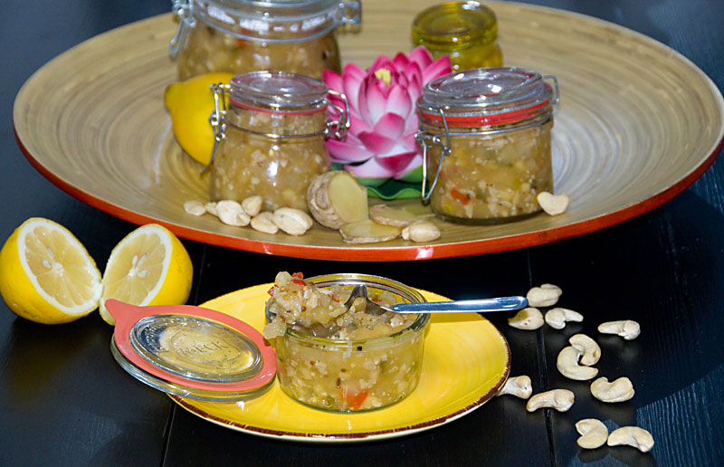 3. Z grubsza posiekaj orzechy nerkowca i wymieszaj z musztardą. Ponownie krótko zagotuj i natychmiast przelej do wysterylizowanych słoików. Zamknij słoiki i pozwól im ostygnąć do góry dnem przez kilka minut.