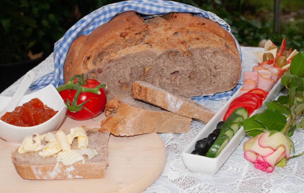 Orzechy nie tylko zmieniają smak naszego, codziennego chleba, ale urozmaicają i wzbogacają nasze posiłki. Orzechy włoskie w tym przypadku, są bardzo bogatym źródłem wielonienasyconego kwasu tłuszczowego omega-6 oraz kwasu omega-3. Zawierają one także cenne dla zdrowia aminokwasy, witaminy z grupy B oraz minerały jak potas, fosfor, magnez, cynk, mangan i jod. Te wszystkie źródła zdrowia znajdziecie w dzisiejszym chlebku. Zapraszam i życzę smacznego!