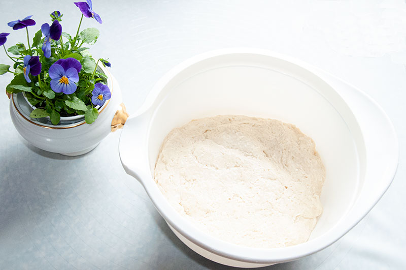- dzień wcześniej wszystkie drożdże z lodówki odświeżyć 100 g maki „00”, 50 g wody, pozostawić w kuchni na noc, jeśli jest chłodna. Następnego dnia 100 g potrzebowałam do tego chleba, 125 użyłam do chleba koperkowego z pestkami dyni, który także po chwili piekłam, a 50 g jak zwykle nakarmiłam i odstawiłam do lodówki, do dalszego hodowania