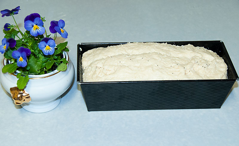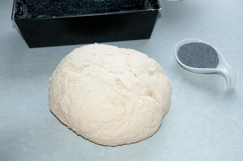 3. Ponownie krótko zagnieść ciasto na posypanej mąką blacie, wygnieć ciasto i uformuj w długi bochenek. Posyp blaszkę posmarowaną masłem, makiem i włóż do niej bochenek. Przykryj i odstaw do wyrośnięcia w tym samym, ciepłym miejscu na około 40 minut, aż bochenek wypełni blaszkę. Bochenek nacinamy wzdłuż i pieczemy na dolnej szynie.