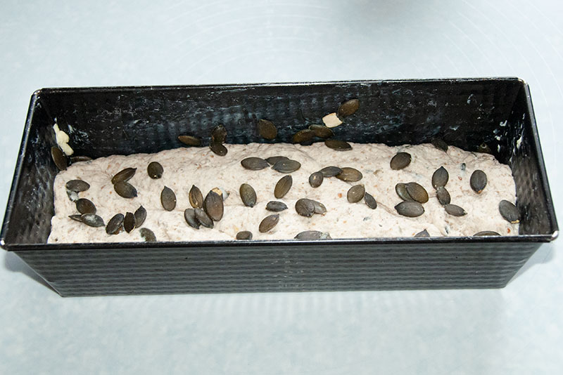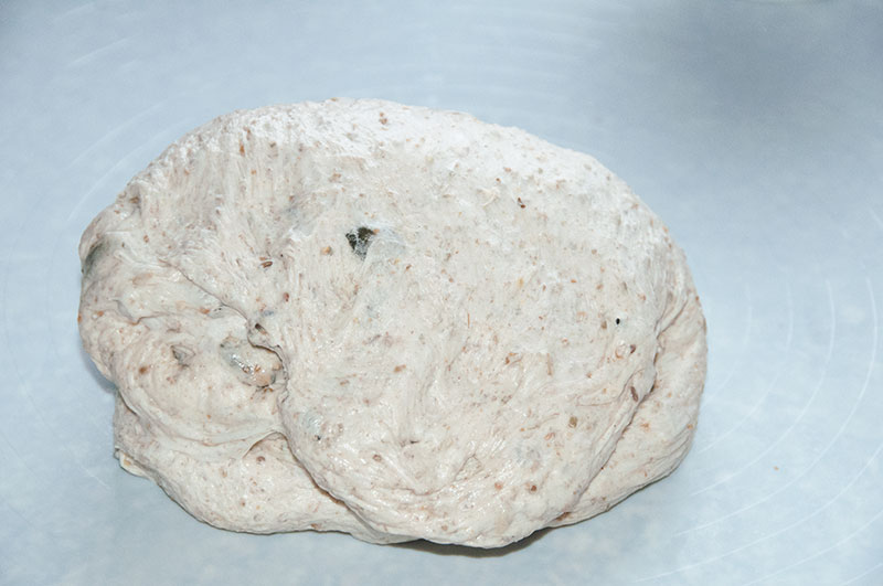 2. Wyłożyć ciasto na matę, ponownie zagnieść i uformować w długą bułkę. Ciasto przełożyć do wysmarowanej tłuszczem formy, przykryć i ponownie odstawić na ok. 30- 50 minut.