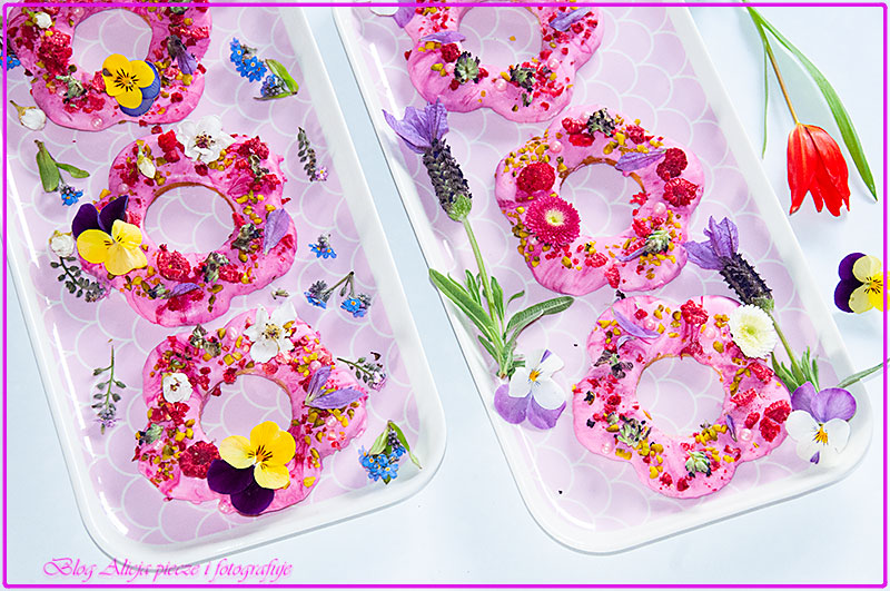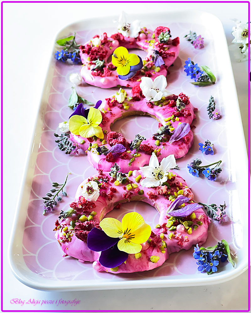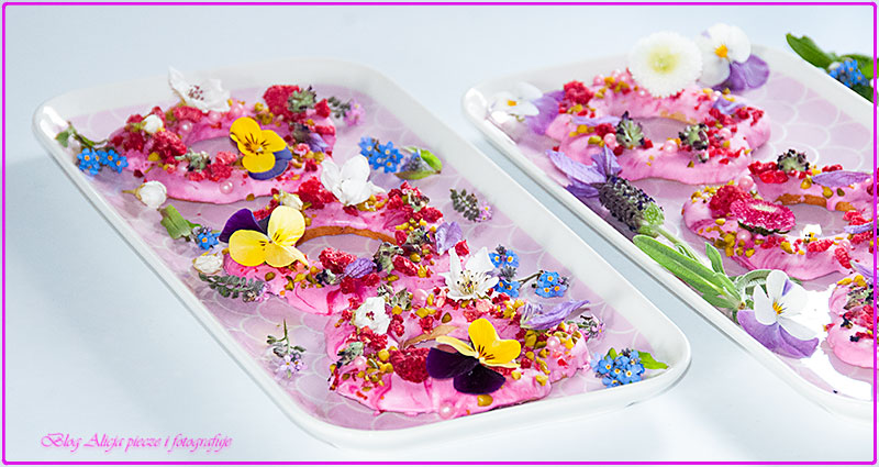 oprócz tego : suszone, świeże jadalne płatki i kwiaty, 2 łyżki liofilizowanych malin i 50 g posiekanych orzeszków pistacjowych do dekoracji