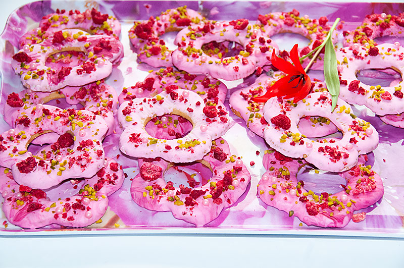 3. Poglazuruj ciasteczka i udekoruj według uznania. Pozostaw do wyschnięcia. Maliny i pistacje posyp zanim ciasteczka wyschną, a kwiatki układaj przed podaniem na stół.