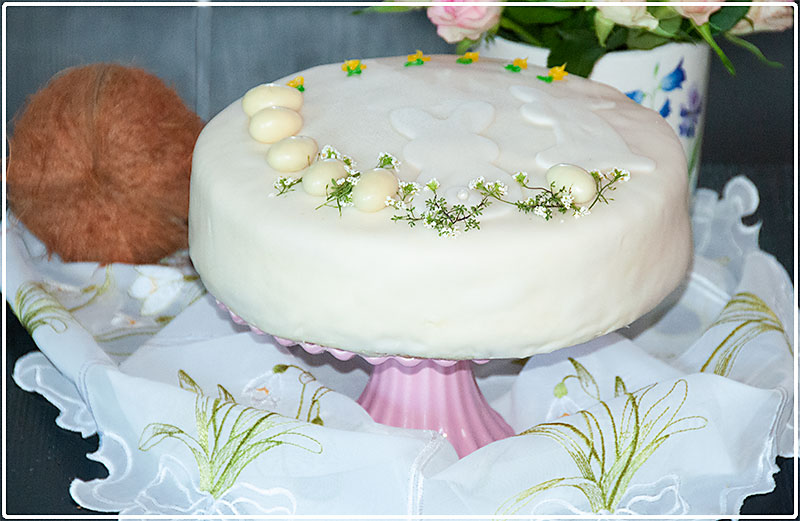 6. Z pozostałej masy cukrowej wyciąć króliczka. Połóż króliczka na Fondant na powierzchni tortu i napisz na nim cukrem, jak chcesz, albo namaluj coś, albo nic nie rób. Ciasto podawać udekorowane migdałami w cukrze i kwiatami.