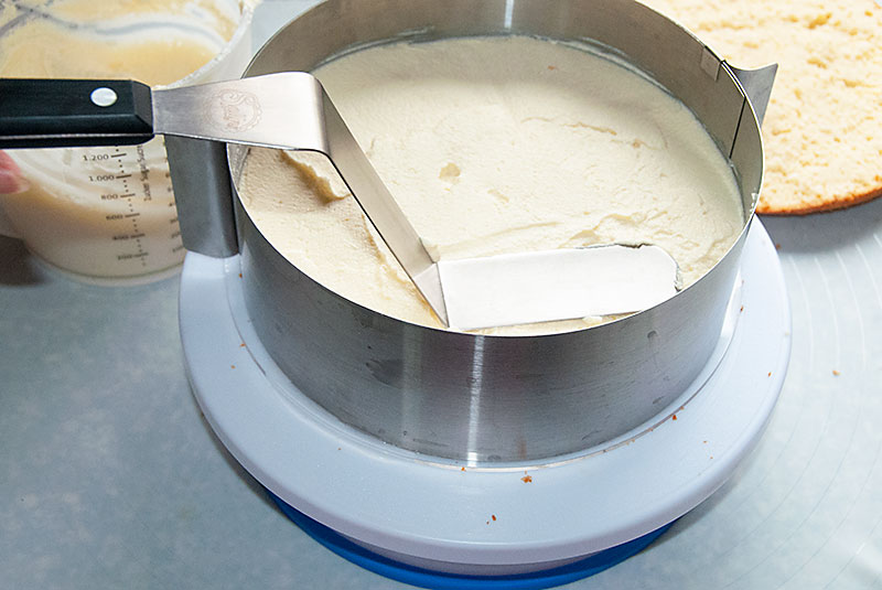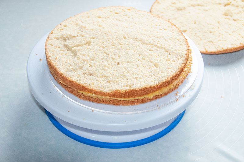 3. Biszkopt kroimy dwukrotnie poziomo. Dolną warstwę ułożyć na talerzu, obłożyć pierścieniem do tortów i posmarować Lemon Curd.
