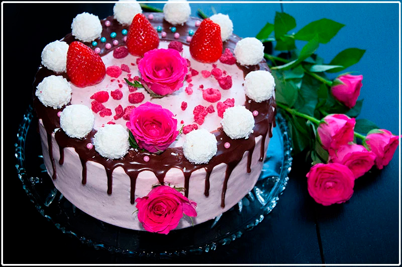 - kilka truskawek, suszone maliny, kilka perełek kolorowych i 3 świeże róże, 12 Rafaelo