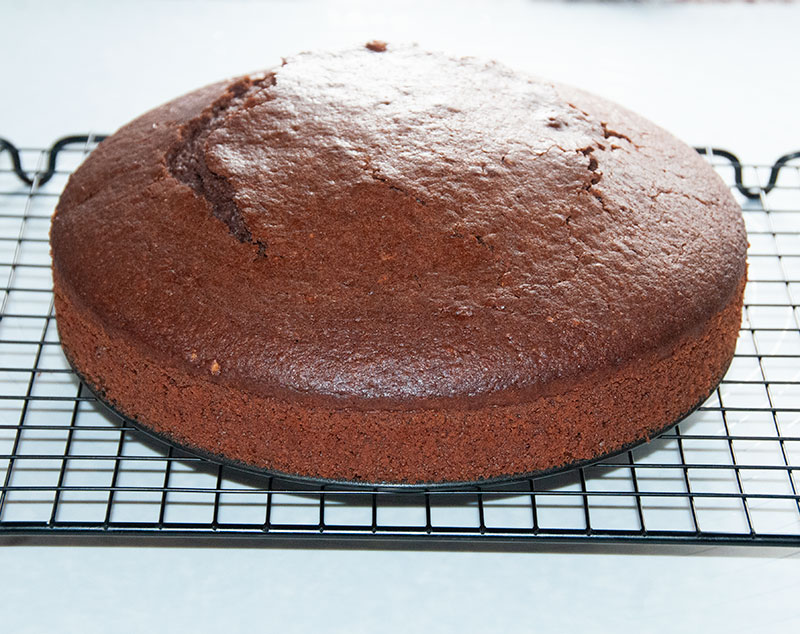 Rozgrzej piekarnik do 170 „C grzania góra/dół. Ustaw pierścień do pieczenia na 24 cm , postaw na blasze wyłożonej papierem do pieczenia i zawiń papier dookoła pierścienia, aby uszczelnić, ciasto jest luźne. Piekąc w rancie dopasujesz lepiej wielkość tortu do dysków do tynkowania tortu. Jeśli nie masz tych akcesoriów użyj po prostu tortownicy o średnicy 24 cm.