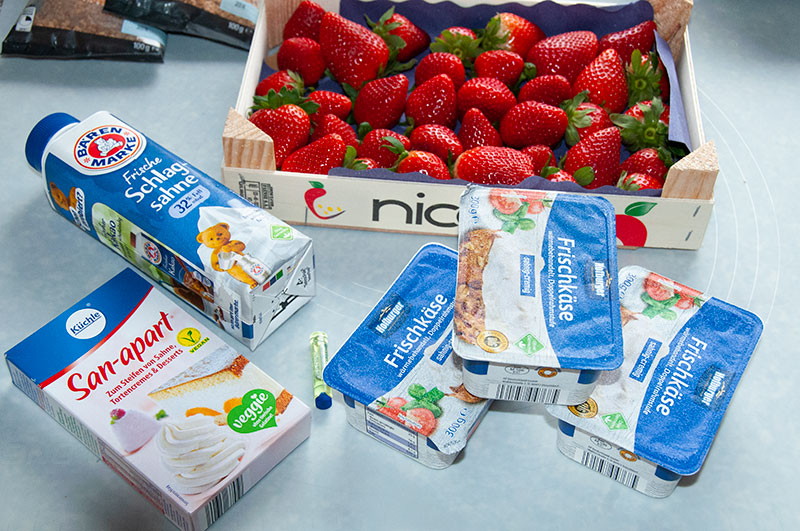 Do pure z truskawek wmieszaj serek śmietankowy z cukrem pudrem i ekstraktem waniliowym, dodać śmietanę ze Śmietan -Fix i ubić na sztywny krem. Pokrój świeże truskawki w ósemki.