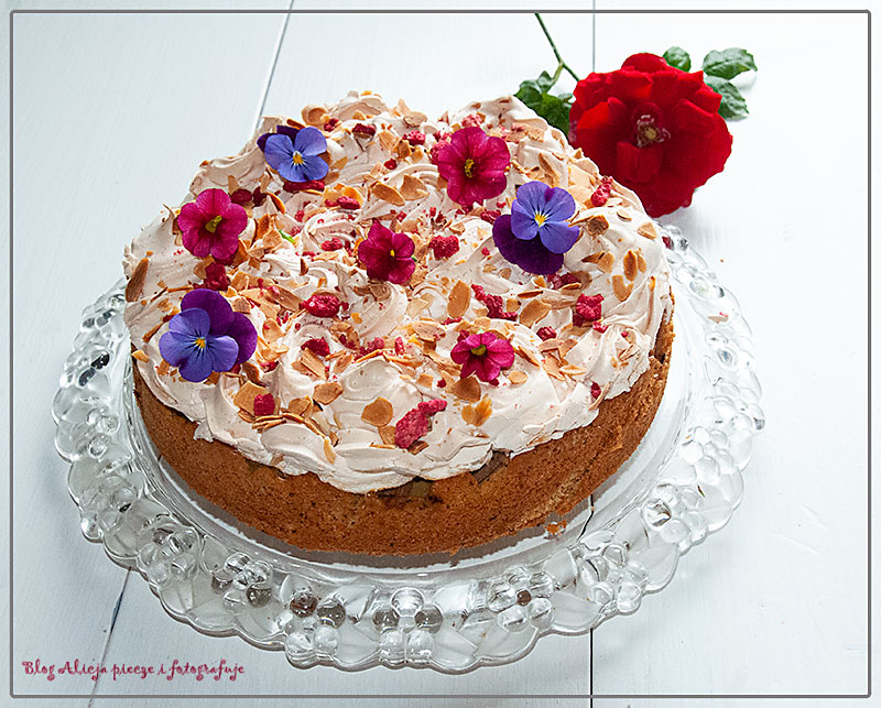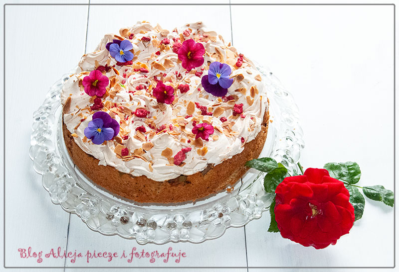 Zacznij ubijać bezę już 10 minut przed zakończeniem się czasu pieczenia ciasta. Białka ubij ze szczyptą soli i sokiem z cytryny na sztywną pianę. Stopniowo dodawaj cukier podczas dalszego ubijania. Piana powinna być błyszcząca z wystającymi czubkami, taka ładnie ułoży  się na cieście za pomocą końcówki do szprycowania lub łyżki stołowej, wstaw ponownie ciasto do piekarnika na 25 minut. Jeśli ktoś lubi można posypać płatkami migdałowymi, nawet dla samego wyglądu.