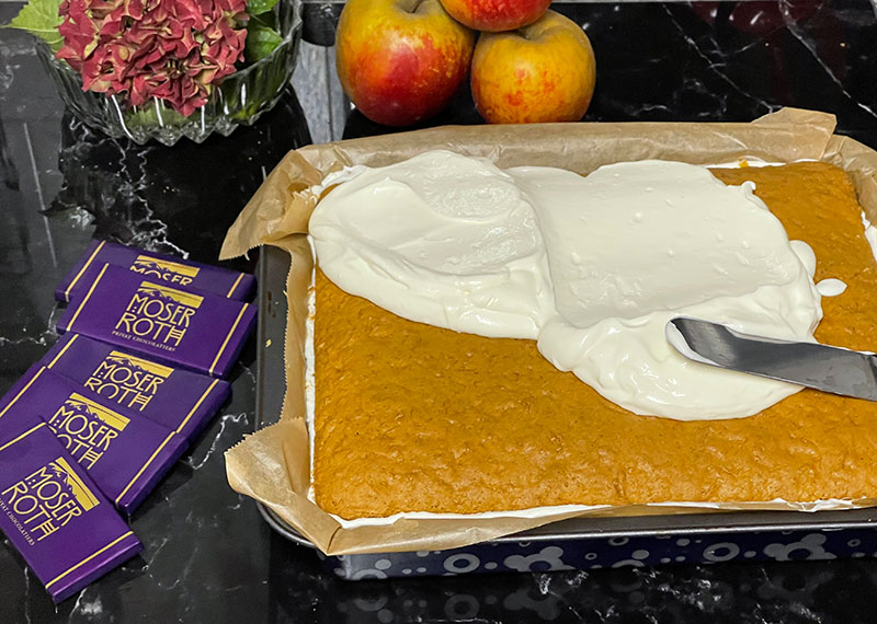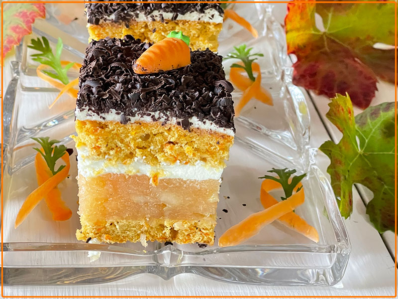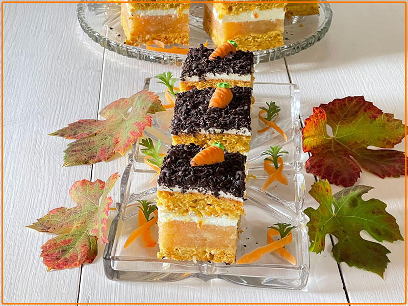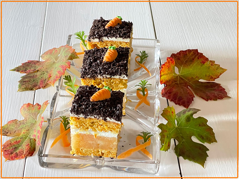 ą część ciasta marchewkowego i wyłóż pozostałą porcję kremu. Na wierzch ciasta zetrzyj czekoladę na dużych oczkach tarki. Wstaw gotowy tort na noc do lodówki, przed podaniem pokrój tort na kwadraty i na każdym z nich  połóż marcepanowe marchewki.