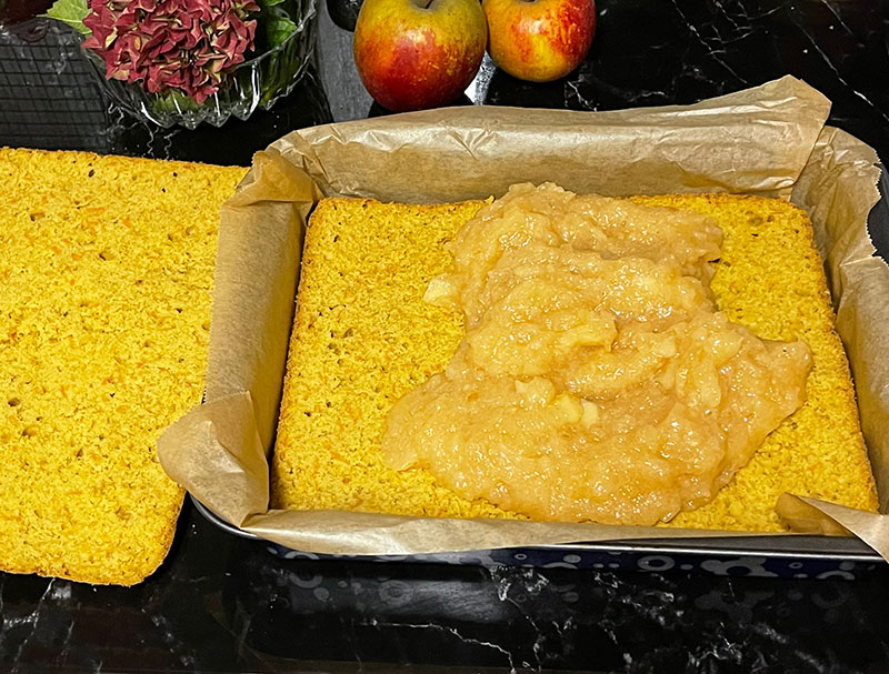 2/3 kremu wyłóż na stężałą warstwę jabłkowo-gruszkową, połóż drug