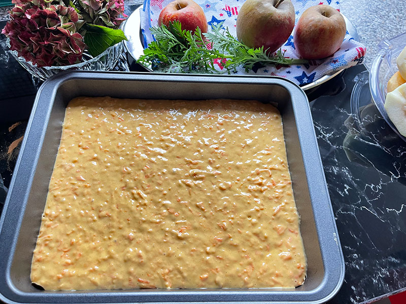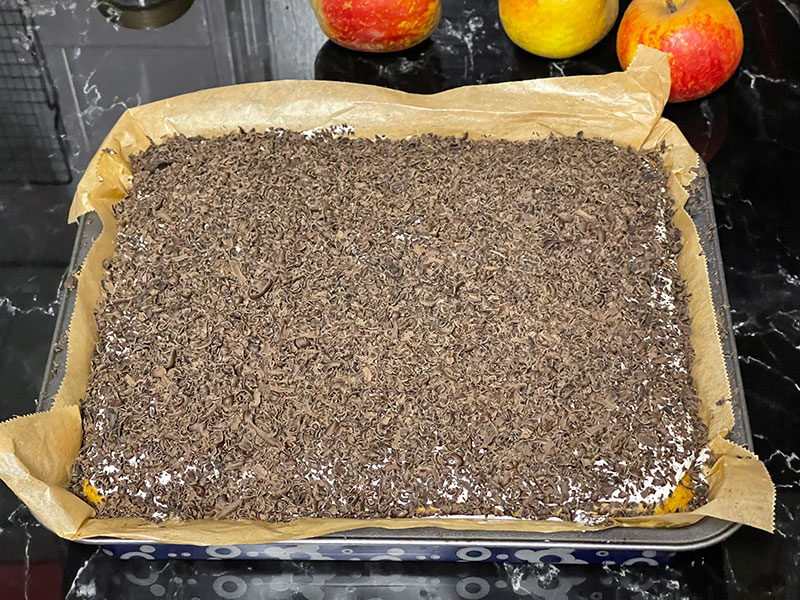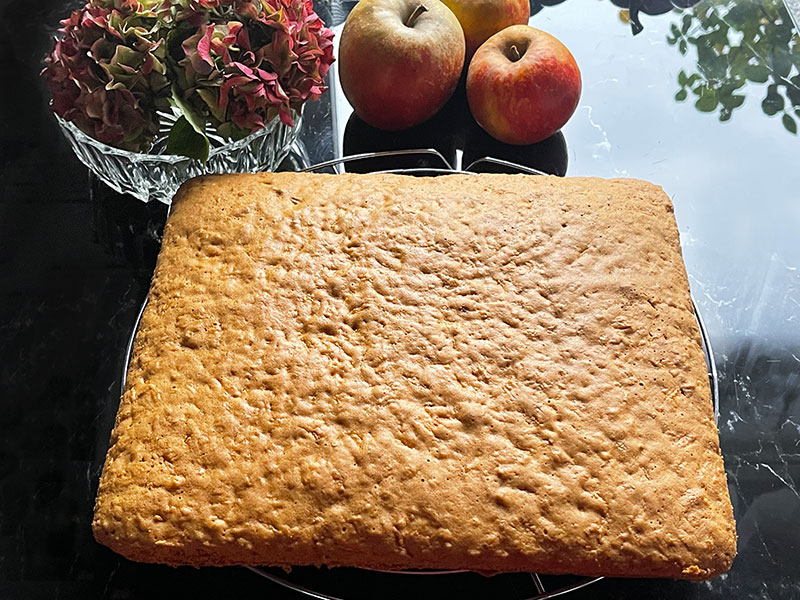 Blaszkę o wymiarach 23 x 27 cm wyłóż papierem do pieczenia. Ciasto wlej do formy i wstaw do wcześniej nagrzanego piekarnika, do 180°, piecz  45 minut.