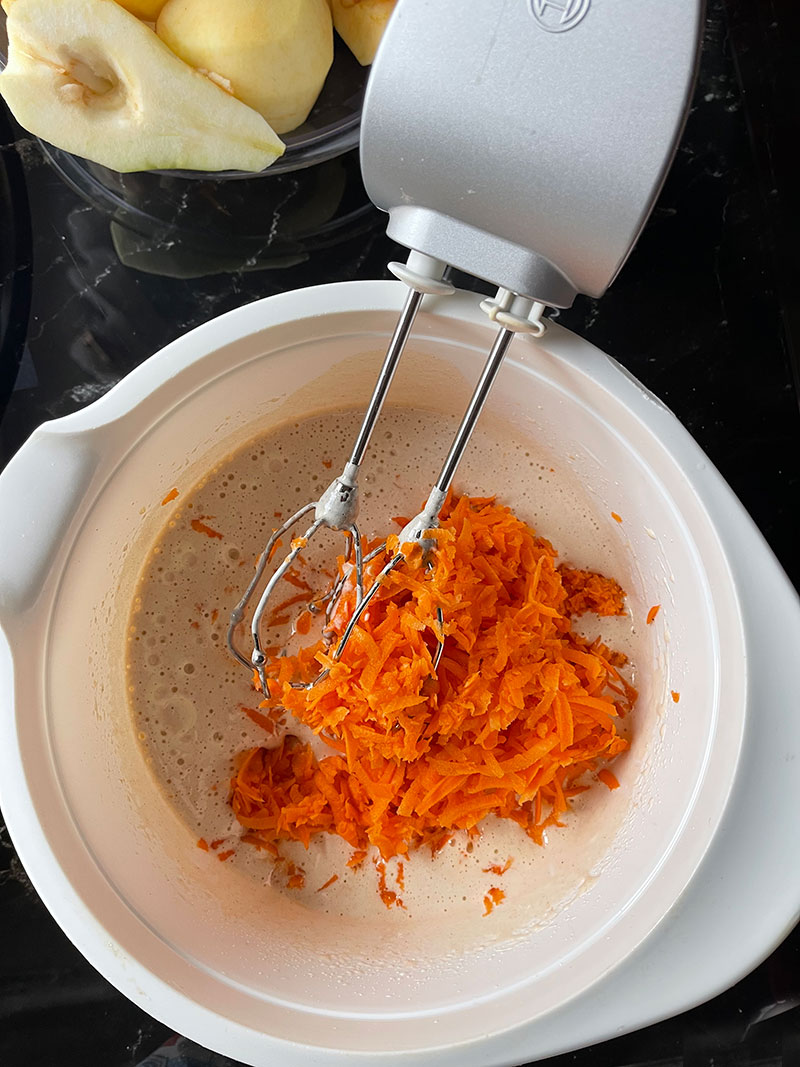Jaja utrzyj z cukrem na puszystą masę. Następnie dodaj olej, sól i startą na dużych oczkach marchew i mieszając wsyp w dwóch porcjach suche składniki. Pozwól wszystkim składnikom dobrze się połączyć.