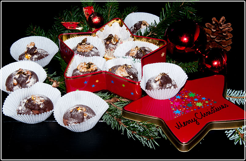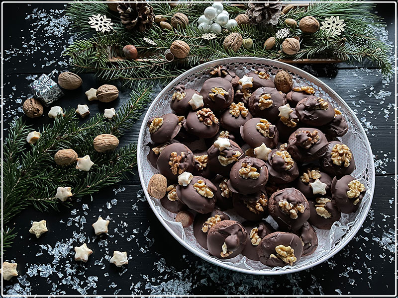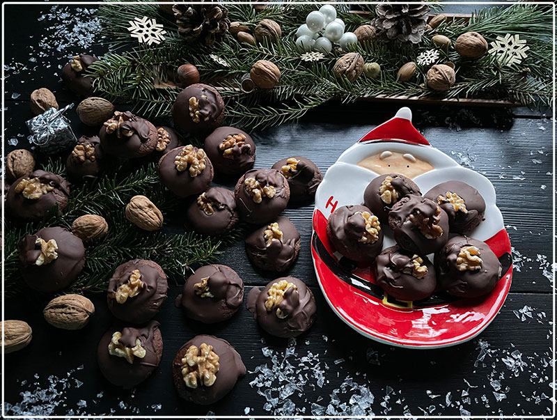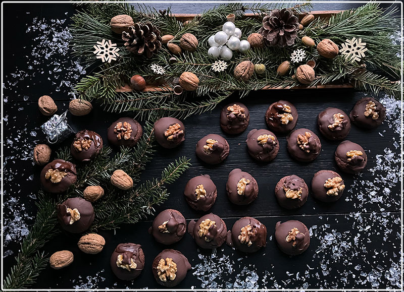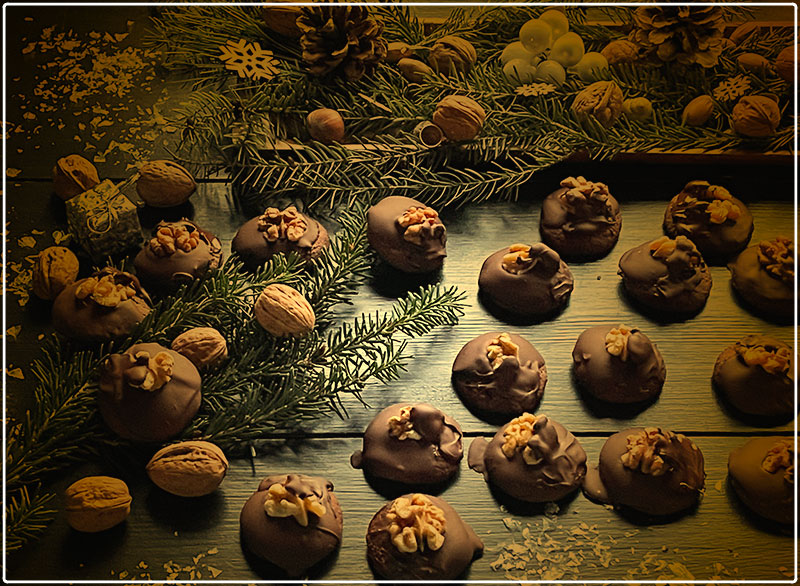 Posiekać kuwerturę i rozgrzać, a następnie posmarować nią ciasteczka. 200 g orzechów włoskich na pół zanurzać w kuwerturze i układać na ciasteczkach. Można posypać złotym pudrem i ozdobić złotem.