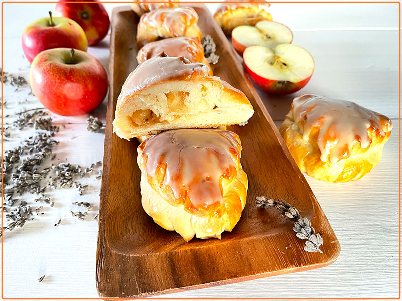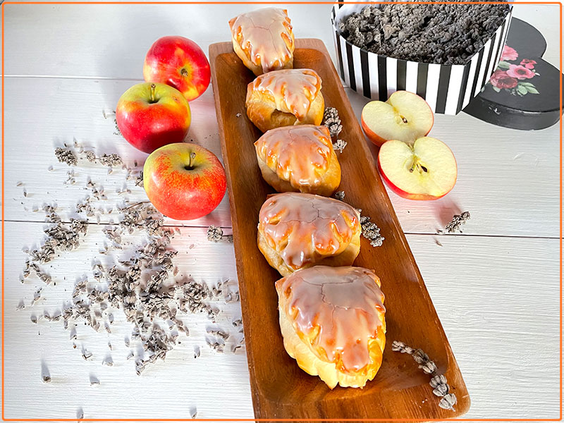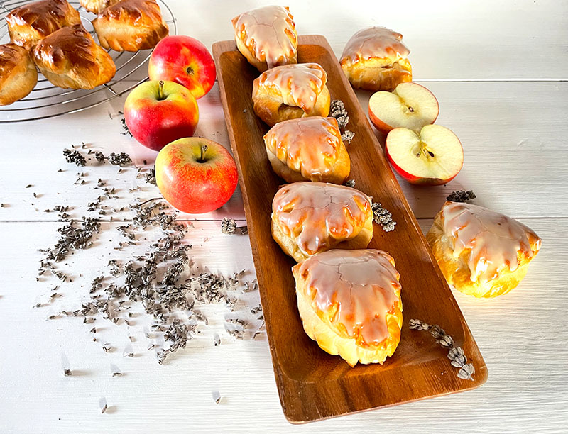 Zapraszam na delikatne, pachnące i kuszące swoim wyglądem bułeczki z jabłkiem, lawendą i nawet z likierem Limoncello! Ci, którzy często odwiedzają moj blog, wiedzą już zapewne, że lawenda, to moje ukochane jadalne kwiaty, które bardzo często dodaję do swoich wypieków. Moja lawenda pochodzi z mojego ogrodu, którą sama suszę i przetrzymuję w szczelnie zamkniętym papierowym pudelku, jak na zdjęciach. Lawenda ciastom dodaje ostrości smaku i wydziela niesamowity aromat już podczas pieczenia, a gdy ugryziemy kawałek takiej bułeczki, budzi się nasz hormon szczęścia i do jego pełni nic więcej już nie potrzebujemy. No chyba, że odrobinę likieru Limoncello, ale ten takze tutaj jest w przepysznej glazurze. Pomyślałam o wszystkim😊Zapraszam po przepis i życzę smacznego!