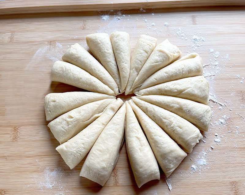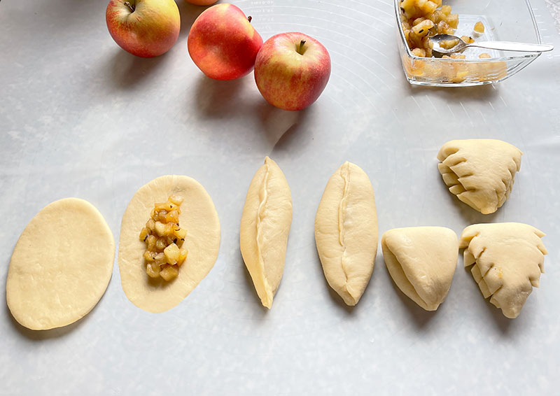 Pokrój 4 średniej wielkości jabłka w drobną kostkę. Umieść 40 g masła na patelni. Smaż jabłka na średnim ogniu przez 10 minut, aż będą miękkie. Wystudź jabłka na boku. Gdy już ciasto dobrze wyrosło, połóż je na stole i uderz w nie kilka razy pięścią, aby Walczyks w nie trochę powietrza. Ciasto podziel na 12-15 równych części. Masa każdej części ciasta wynosi ok.60 g. Z każdego kawałka ciasta uformuj kulkę, przykryj je folią spożywczą i pozostaw na 20 minut do wyrosniecia. Po tym czasie rozwałkuj każdą kulkę ciasta za pomocą wałka do ciasta. Na ciasto wyłóż 1,5 do 2 łyżeczek jabłek. Dobrze sklej brzegi ciasta jak pierogi. Cały ten proces znajduje się na zdjęciu. Zrób po prostu tak samo. Bułeczki układamy na blasze wyłożonej papierem do pieczenia. Wykonaj cięcia nożyczkami na bokach bułeczek, przybiorą kształt i wygląd liścia. Przykryj bułki folią spożywczą. Bułeczki odstawiamy ponownie na 40 minut w ciepłe miejsce do wyrośnięcia, po czym bułki smarujemy roztrzepanym jajkiem i pieczemy w piekarniku nagrzanym do 180°C przez 20 minut.