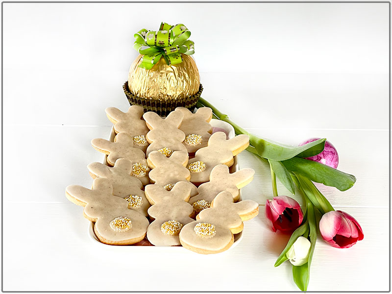 Tipp: U góry na zdjęciu widać ciemne zajączki, te upiekłam eksperymentalnie razem z masą marcepanową dzieląc czas pieczenia na dwie strony. To znaczy po 6 minutach trzeba przewrócić marcepanową stroną na spód i piec dalsze 6 minut. Są przepyszne i w smaku przypominają praliny marcepanowe.