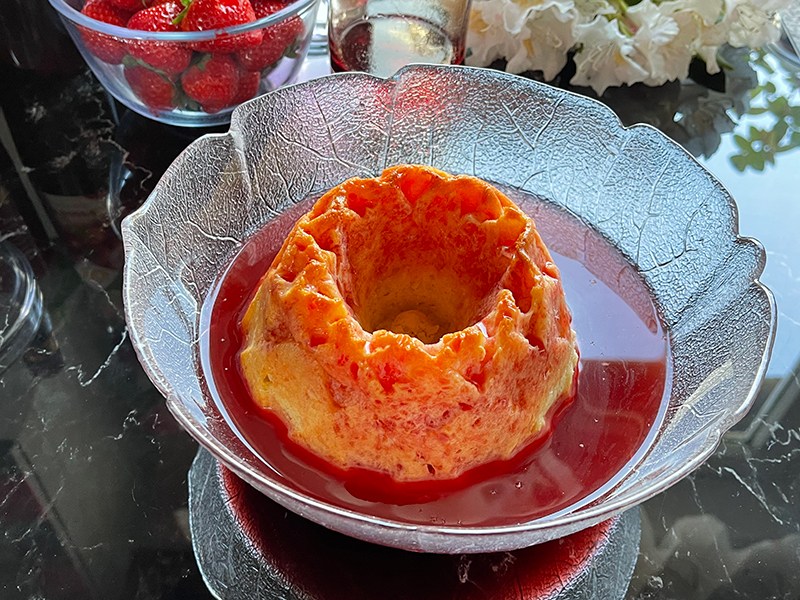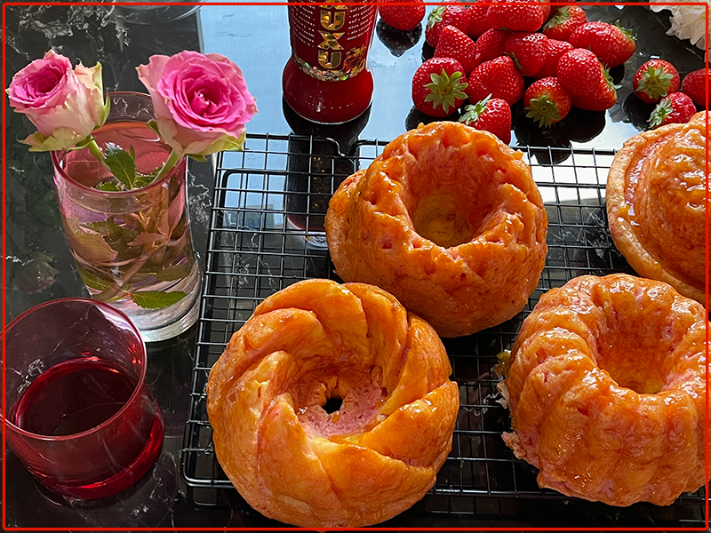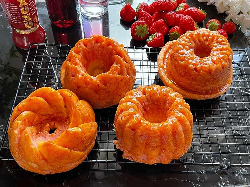 3. Wymieszaj sok truskawkowy i likier do dekoracji. Ja sok zrobiłam z syropu i przegotowanej wody, był smaczniejszy. Wyjmij lekko schłodzone ciasta z patelni. Zamocz savariny w mieszance soku truskawkowego i likieru. Niech ciastka całkowicie ostygną. 4. Rozgrzej dżem morelowy,czy brzoskwiniowy i posmaruj nim Savarins.