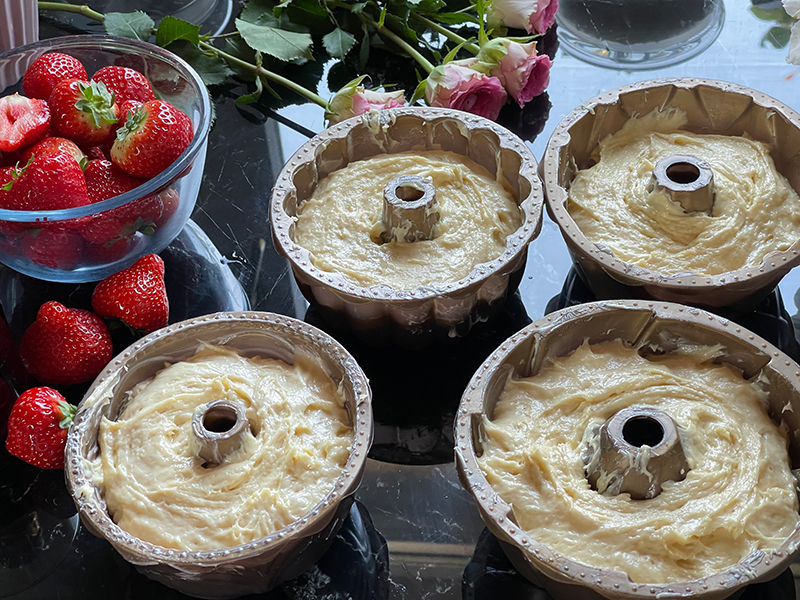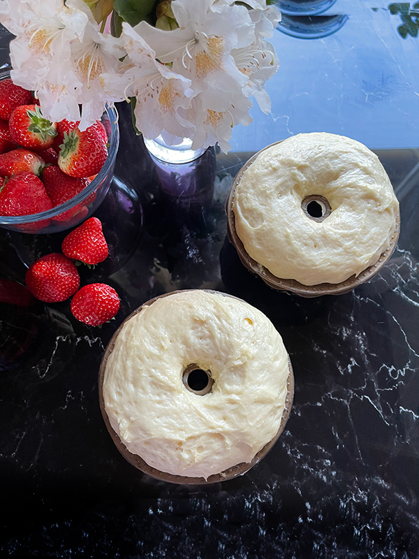 5. Ubić mocno śmietanę. Umieść dużą porcję śmietany na środku savarina. Umyj i pokrój truskawki i ułóż na śmietanie lub pod. Savarins można też podawać bez bitej śmietany!