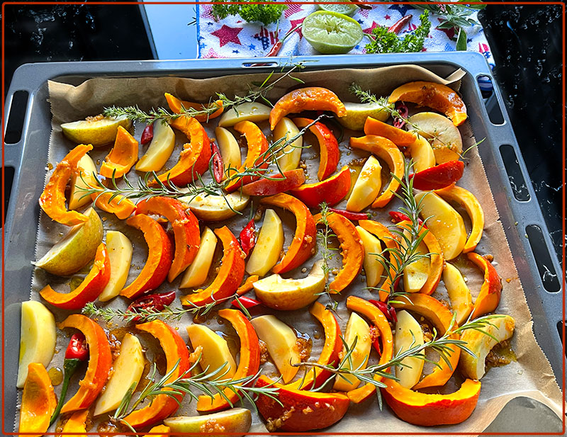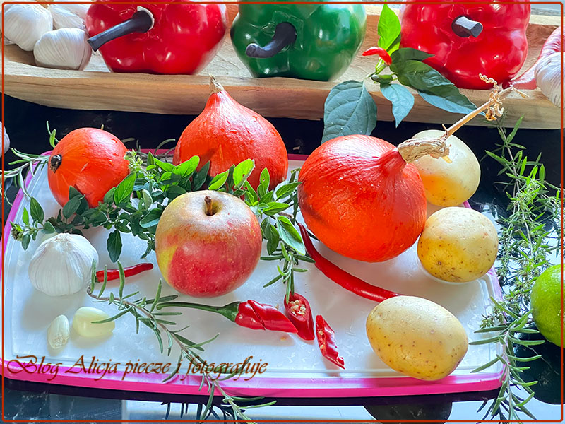 Sposób wykonania właściwie nie wymaga opisu, ale gwoli prawidłowego podania przepisu, podam kilka wskazówek. Tak więc, dynie należy tylko dobrze umyć szczotka, wydrążyć pestki i pokroić na 2 cm łuki. Ziemniaki można również umyć i ze skorka, lub bez pokroić na ósemki. Jabłko również pokroić na ósemki. Wszystkie części ułożyć fantazyjnie na wyłożonej papierem blasze i posmarowanej olejem z oliwek. Następnie 40 ml oleju, przeciśnięty czosnek przez praskę, papryka czerwona ostra, łyżeczka maggi w płynie rozetrzeć na jednolity sos. Sos ten polać po dyni i reszcie składników. Wstawić do rozgrzanego piekarnika do 220°C i piec 30-40 min. Do polowy czasu pieczenia piec przykryte drugim papierem, po 20 min, zdjąć papier.