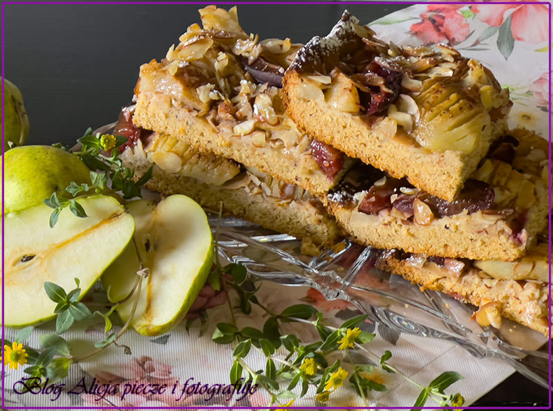 Jak co roku o tej porze czas na gruszki, jabłka i śliwki, ten czas jest bardzo piękny dla smakoszy tych owoców, ale również dla nas, którzy lubią piec ciasta. Dzisiaj jedno takie ciasto orzechowo -migdałowe, mocno skombinowane smakowo, dlatego tez niepopularne, bo właśnie pierwszy raz pieczone. Marcepan zawsze pasował mi z jesiennymi owocami jako, że to przecież migdały, a ciasto migdałowe sprawdza sie dlatego, że soki z owoców wspaniale mogą je nawilżyć nie robiąc z niego miazgi. O orzechach laskowych nie mozna zapomnieć przy takim jesiennym cieście, tak wiec tez sie tu znalazły. Smaku niestety nie moge tu opisać, po prostu palce lizać! Polecam i zapraszam!
