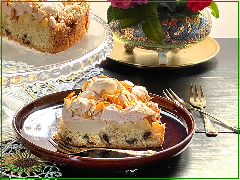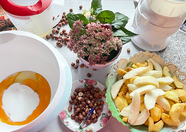 Cukier, żółtka i jajko wraz z masłem utrzeć na jednolitą masę. Orzechy zmielić grubiej, lub drobno posiekać, dodać do masy. Mąki wymieszać z proszkiem do pieczenia i cukrem waniliowym, dodać do masy, i wymieszać na wolnych obrotach. Na koniec wmieszać Schoko Chunks. Dno formy wyłożyć papierem, a boki posmarować masłem. Ciasto równomiernie rozłożyć na papierze, a następnie ułożyć na nim części jabłek jedna za drugą. Wstawić ciasto do piekarnika i piec 25 minut na górnej szynie.