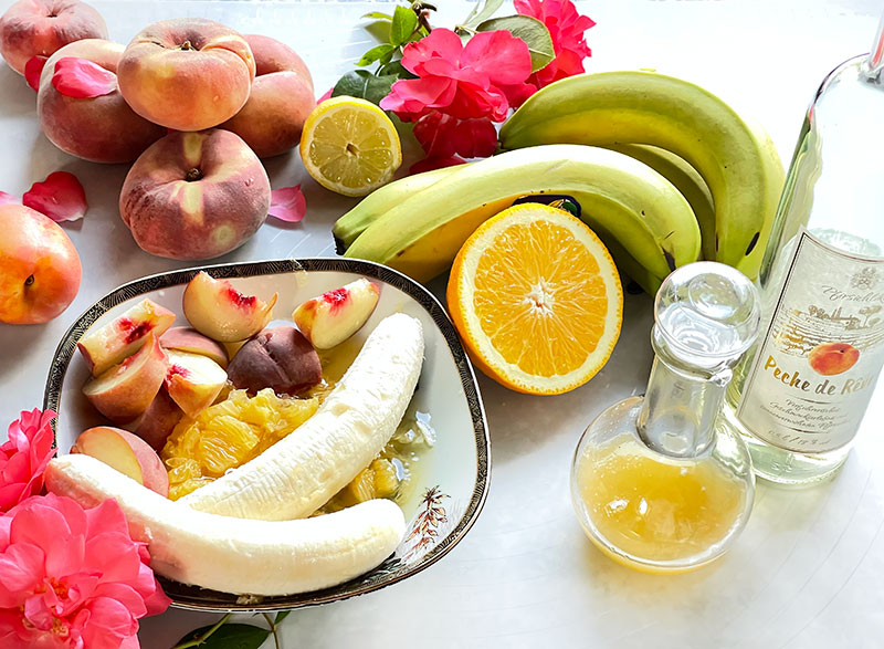 Do sosu: jedna pomarańcze odfiletować, a z drugiej wycisnąć sok, dodać banana, imbir i wszystkie składniki zmiksować. Mus przelać do rondelka, zagotować i dolać likier brzoskwiniowy. Gotować kilka minut, aż uzyskamy odpowiednią konsystencję gęstego, ale cieknącego sosu, którą z reszta możemy regulować likierem. Orzeszki Macadamia kładziemy na wierzch po polaniu sosem przed spożyciem.