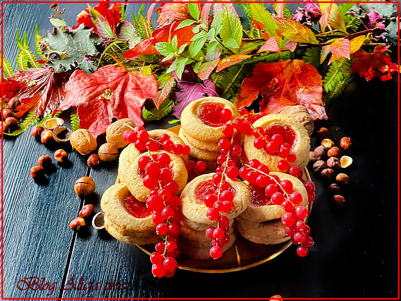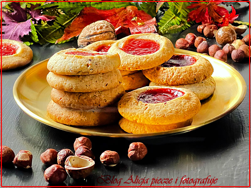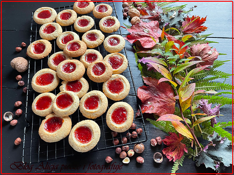 4. Wgłębienie wypełnić galaretką lub konfiturą porzeczkową lub żurawinową. Piecz ciasteczka pojedynczo (tworząc dwie lub trzy blachy do pieczenia) przez 10-15 minut każde, aż będą jasnobrązowe i poczekaj, aż całkowicie ostygną przed jedzeniem.😂