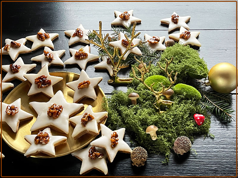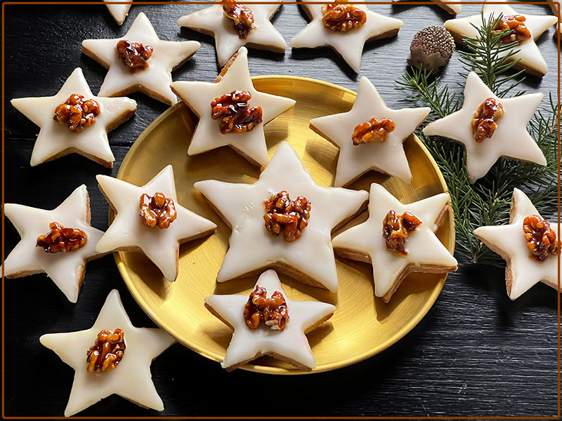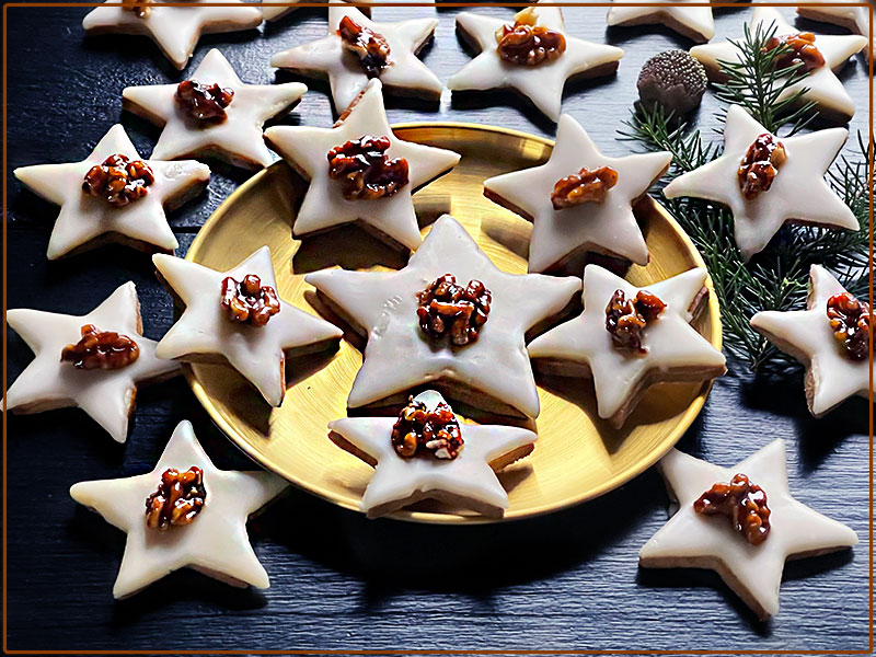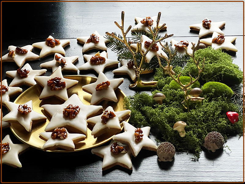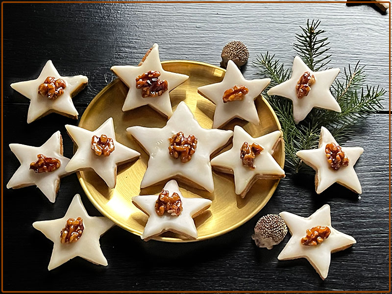Ciasto z pomiędzy gwiazdek ponownie zagniatamy, rozwałkowujemy i wycinamy gwiazdki. Blaszkę wsuwamy do piekarnika na środkową szynę. Pieczemy w 180°C 12 min. Masę marcepanową zagniatamy z cukrem pudrem/200g/ . Wyrobioną masę umieszczamy pomiędzy dwiema foliami i rozwałkowujemy /na dwa razy/ możliwie cienko, po czym wycinamy takie same gwiazdki jak wycinaliśmy z ciasta. Ostudzone ciastka gwiazdki smarujemy letnim żelem z czarnego bzu i układamy na nich gwiazdki wycięte z marcepanowej masy. Orzechy namaczamy w gorącym syropie z czarnego bzu, na patelni rozgrzewamy cukier i wrzucamy orzechy razem z syropem, karmelizujemy je, wygotowując wodę i chwilkę jeszcze podsmażamy otaczając całe w cukrze. Gwiazdki smarujemy lukrem i na każdą kładziemy część orzecha. Syrop z czarnego bzu nie musi być, jesli ktoś nie zrobił wcześniej, moze być marmolada – gel swojska, rozpuszczona w wodzie./200 g marmolady 75 g wody/Ja również zrobiłam taki z własnej marmolady, na którą przepis znajdziesz tutaj.