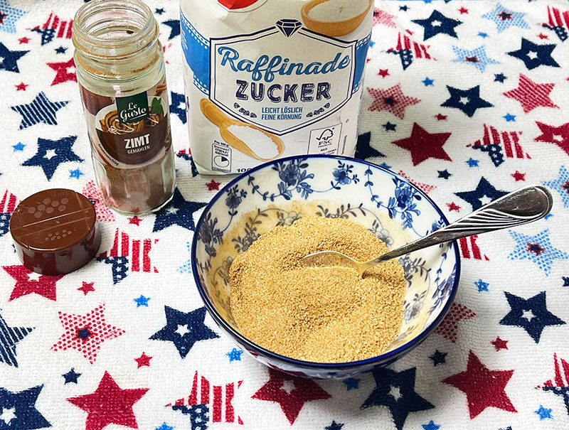 Przygotować posypkę cynamonowa: W małej misce wymieszaj ¼ szklanki cukru i 2 łyżeczki mielonego cynamonu.