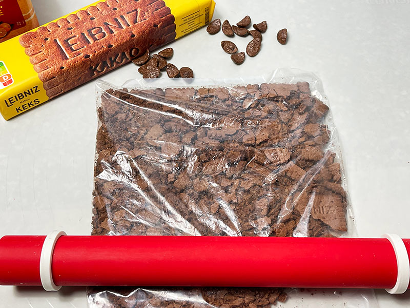 Herbatniki /jak widać na zdjęciu/dobrze rozdrobnić wałkiem, albo jakimś urządzeniem elektrycznym. Dodać wszystkie inne składniki i wymieszać mikserem, albo ręką. Moja rada jest jednak ręką, ponieważ lepiej jest, gdy nie ma większych kawałków w masie, które potem utrudniają wtykanie kruchych płatków. Dlatego też, mimo że byłyby szyszki smaczniejsze z bakaliami, ale te analogicznie też będą przeszkadzały w umieszczaniu płatków. Jeśli lubisz rodzynki i Canberry, to umieść ich trochę na oddzielnym talerzyku. Masa musi mieć taka konsystencje, aby dala się formować w miarę stabilne kulki, ale miękkie, w które z łatwością będzie można wbijać wspomniane już kruche płatki. Wyregulować trzeba dosypując herbatników lub tez dolewając likieru. Jeśli zachowasz podane proporcje, nie będzie problemów. Najpierw formujemy kulki, polecam w rękawiczkach jednorazowych, które pozostają cały czas czyste i nic nie klei się do nich. Następnie z kulki formujemy stożek i zaczynając od jego góry, wbijamy płatki czekoladowe jak na zdjęciu. Płatki wbijamy dookoła kulki tak, aby zachodziły jeden na drugi, tworząc tym samym szyszkowe łuski.