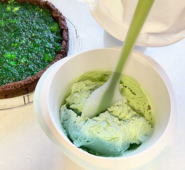 Na koniec udekorować tort białym kremem i kawałkami zielonego Tortengussu rozlanego wcześniej w tym celu na talerzyku.