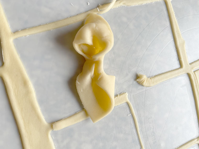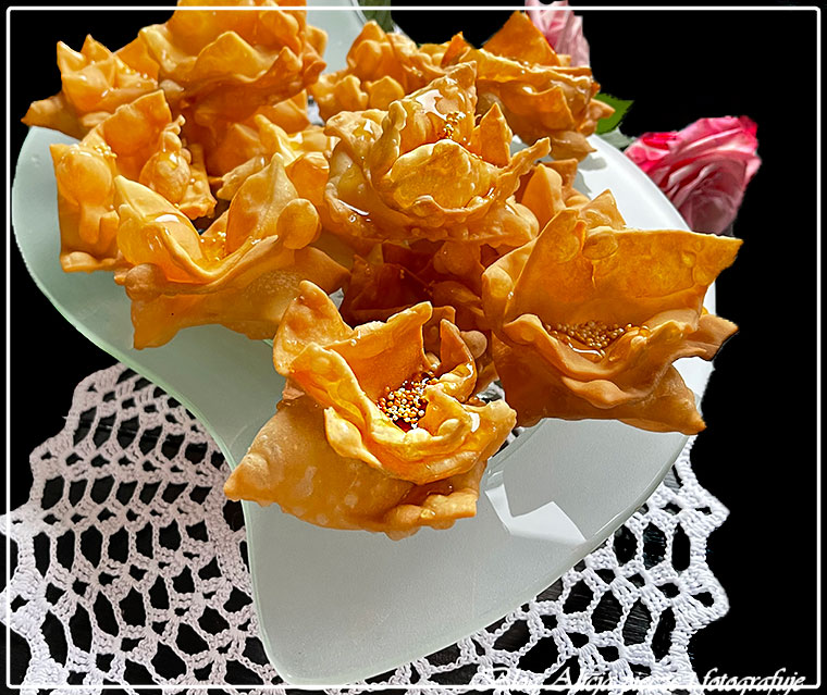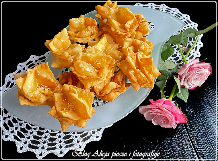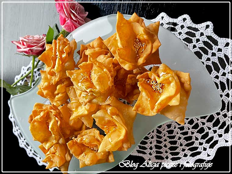 Składniki oprócz jajka i wody rozgnieść w rękach na mokry piasek. Następnie dodać jajko i Blutenorangenwasser, ponownie zagnieść na jednolite ciasto i uformować dwie kule, owinąć je w folię spożywcza i włożyć do lodówki na 2 godziny. Następnie pracować z kulami pojedynczo, druga wyjąć z lodówki, ale zostawić w folii na stole. Jedną kule rozwałkować nieco w e wszystkie strony, złożyć na trzy w długi pas, nieco go rozwałkować, ponownie złożyć na 3 razy w mały czworokąt, czynność te powtórzyć trzykrotnie, po czym rozwałkować ciasto bardzo cienko jak tylko się da. Z placka wycinać kwadraty 6 cm i składać po trzy sztuki kątami na przemian, w różnych ich położeniach. Pośrodku sklejać odrobiną białka wcześniej odjętego z jajka do ciasta. Pośrodku, gdzie znajduje się punkt sklejenia przycisnąć palcem, jeśli jest bez długiego paznokcia, albo kuleczką taką jak na fotce. Dlatego zaznaczam- bez paznokcia- bo nie należy przebić ciasta. Olej rozgrzać do 17 – 180°C i piec złożone kwadraty z patyczkiem w środku, aby się nie zamknęły za mocno, a stworzyły podczas pieczenia kształt podobny do kwiatów. Wyjmować łyżką cedzakową na ręcznik papierowy, po chwili przenieść różyczki na talerz docelowy. Następnie różyczki polewamy odrobina naturalnego, rzadkiego miodu, a w środek wsypujemy ziarenka np. sezamu, albo drobnych cukiereczków dekoracyjnych imitujących środek kwiatka. Życzę milej zabawy i smacznego!
