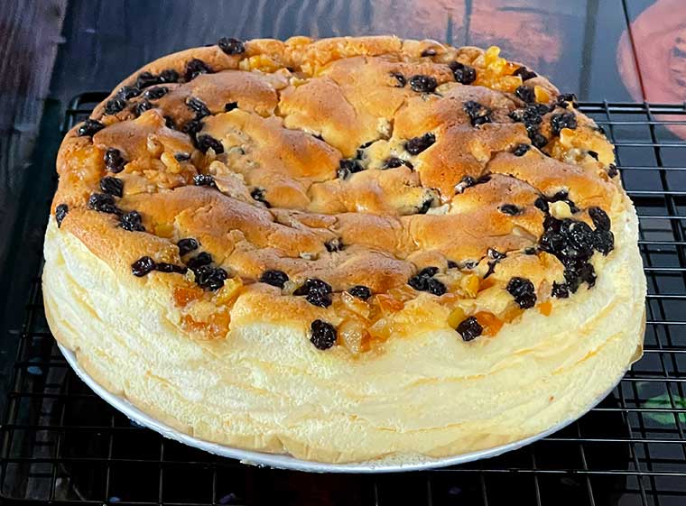 Wlewamy masę do dwóch takich samych form a. 20 cm, wrzucamy do każdej formy połowę rodzynek oraz Orangenat i pieczemy w rozgrzanym do 160°C piekarniku 65 minut. Nie sprawdzać patyczkiem i nie otwierać podczas pieczenia. Jeśli będą to takie formy, jak moje, czyli aluminiowe i 20 cm średnica, ten podany czas gwarantuje, że serniki będą upieczone.