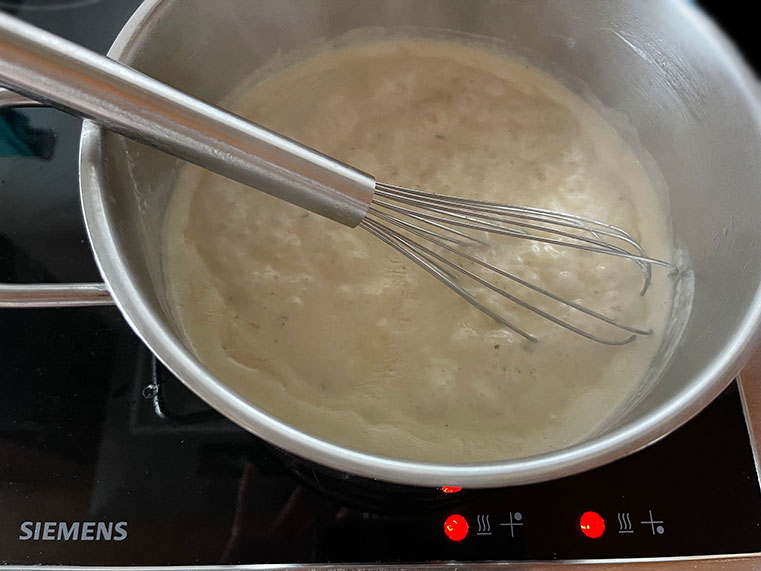 Następnie bardzo powoli, ciągle mieszając, wlać do zasmażki 500 ml wody z gotowania (bulionu), następnie dodać 300 ml śmietanki. Mieszając, pozwól sosowi chwilę się zagotować i zgęstnieć.