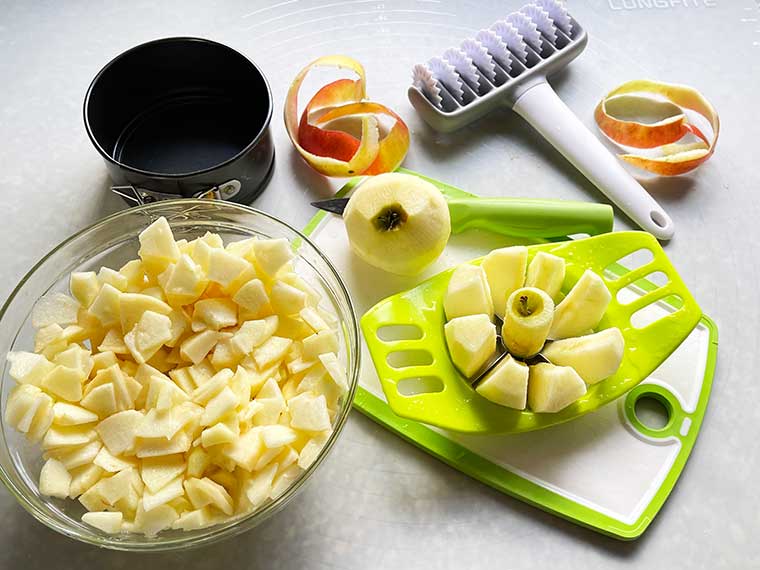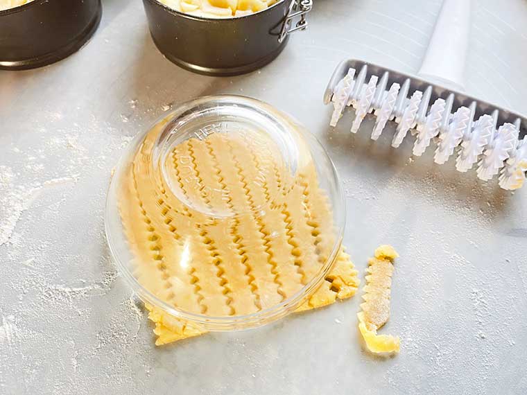 Ciasto zagnieść z podanych wyżej składników, podzielić na 4 porcje i włożyć owinięte w folię do lodówki. Jabłka umyć i obrać a następnie pokroić stalowym jabłuszkiem na ósemki, a potem w plasterki. Cytrynę wycisnąć i sokiem polać po wszystkich jabłkach, aby nie ściemniały. Cytryna nada również odrobinę kwaskowej nuty, przyjemnej w smaku. Wyciąć z papieru cztery kola i wyłożyć dna tortownic. Następnie ciasto pojedynczo wyjmować z lodówki. Z każdej kulki odciąć kawałek na paski i resztę rozwałkować na placek o średnicy 14 cm. Ułożyć w tortownicy na to położyć jabłka, posypać 2 łyżkami cukru, poł łyżeczki cynamonu, 1 łyżkę Canberry. Odciętą część ciasta rozwałkować i pociąć na paseczki, następnie położyć na paskowane ciasto miskę o średnicy 10 cm i wyciąć koło. Brzegi spodu posmarować roztrzepanym jajkiem, z koła wybrać pasujące do okręgu tortownicy sztuki i ułożyć kratkę. Pierwsze paski posmarować jajkiem a potem położyć poprzeczne paski. Paski docisnąć lekko na rancie ciasta. Na koniec posmarować jajkiem wierzchnie paski.