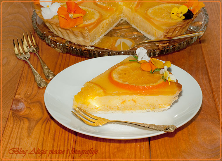 Polewamy odrobiną galaretki tarte, pomarańcze nieco przycinamy do obrzeza tarte i układamy na ostatniej zastygniętej warstwie tarte. Następnie miedzy plastry pomarańczy wylewamy resztę galaretki i wstawiamy do lodówki na 30 minut. Tarte jest gotowe!