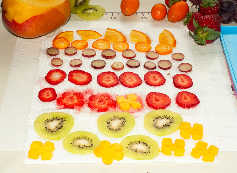 ● owoce: zielone kiwi, truskawka, pomarańcza, kumkwat, mango, winogrona, Kumquat, wszystkie myjemy i kroimy na cienkie plasterki układając je na papierze z kuchennej roli, aby całkowicie pozbyć sie soku.