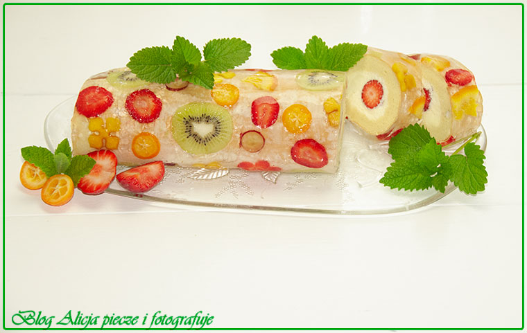 Tak więc, w małym naczynku zalewamy żelatynę 60 g zimnej wody i odstawiamy do zmiękczenia. Następnie w innym naczyniu z 155 g gorącej wody rozpuszczamy cukier, dodajemy sok cytrynowy j/w i dodajemy żelatynę, po czym żelatynowy roztwór studzimy do 27°C i tylko takiej, dokładnie takiej. Na silikonowa powierzchnię w blaszce 23×23 cm układamy osuszone plasterki owoców i wylewamy pomiędzy nie tyle żelatyny, aby nie pływały, ale żeby bylo zakryte dno. Ostrożnie wstawiamy zalane owoce do lodówki na 10 min i ponownie zalewamy plasterki resztą żelatyny, wstawiamy do lodówki. Gdy żelatyna się zsiądzie wyjmujemy roladę z lodówki, rozpakowujemy z pergaminu i zawijamy ja w żelatynę z owocami. Wspaniale tu pomaga właśnie silikonowa forma, na którą należy wylać wcześniej żelatynę. Sa też teflonowe papiery pomocnicze, te też dobrze do tego służą.
