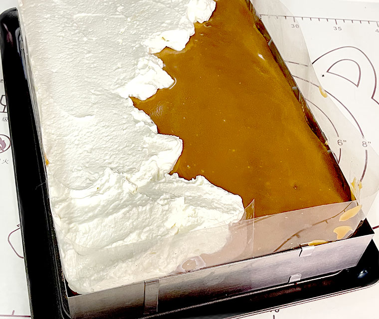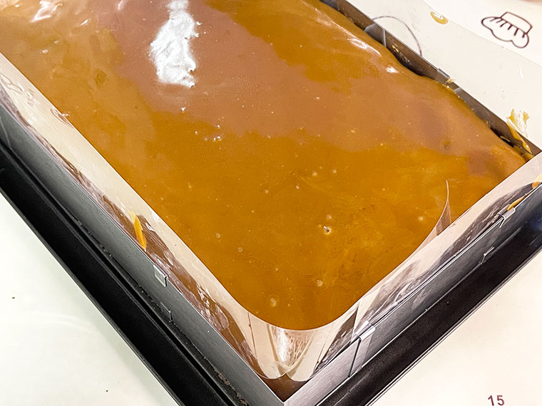 Karmel: Cukier 300 g roztopić na małym ogniu, dodaj masła 140 g i wymieszaj, aż masa będzie gładka. Dodaj śmietanę kremówkę 33-36% 220 g oraz sól 1/2 łyżeczki. Dobrze wymieszaj, aż będzie gładkie. Lekko przestudzony karmel wylewamy na biszkopt nieco nasączony mlekiem. 200 ml karmelu odlać do woreczka foliowego do polania na orzechy.