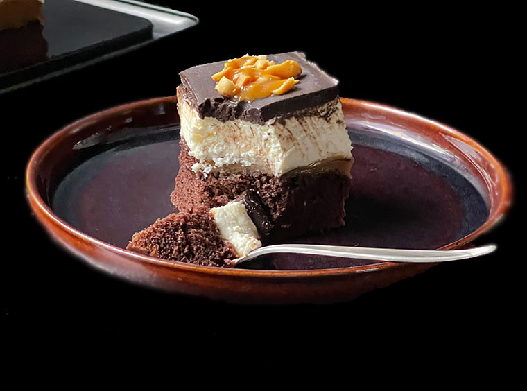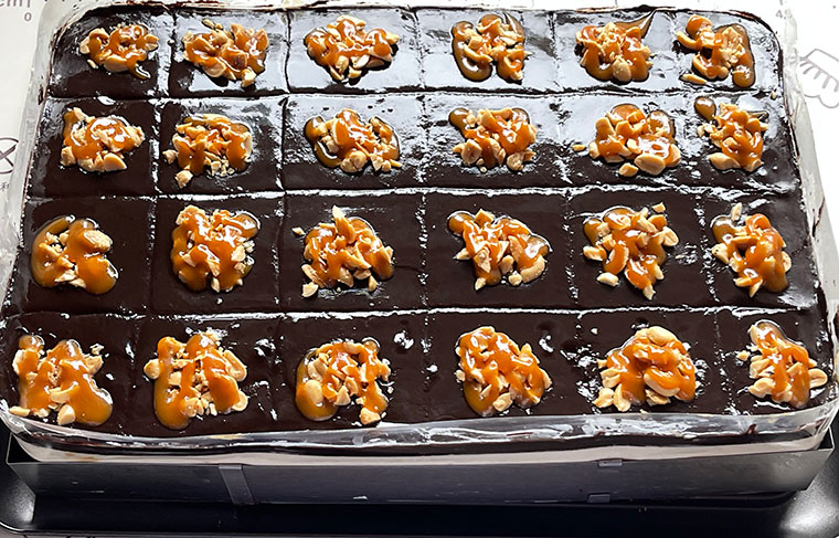 Ganache: czekolada mleczna 140 g, czekolada gorzka 140 g. Podgrzej czekoladę. Dodaj zagotowaną śmietankę lub gorącą 33-36% 220 g. Wylać równomiernie na całą masę serową. Studzić tort kilka godzin, lub zostawić na noc. Udekorować prażonymi orzechami i odlanym wcześniej karmelem.