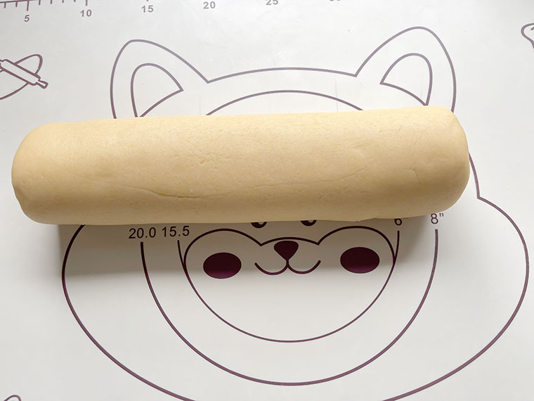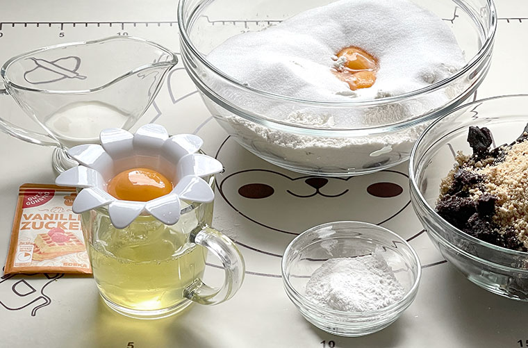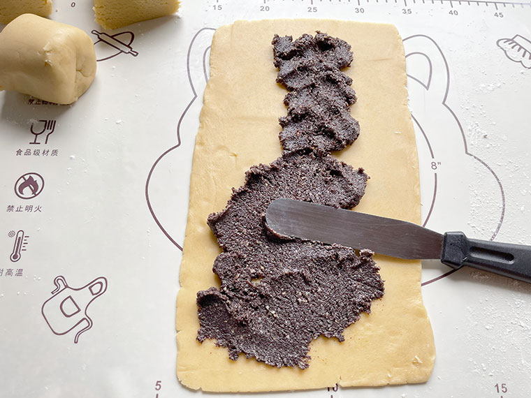 Mąkę, proszek do pieczenia, cukier, cukier waniliowy, margarynę i żółtka wymieszać na gładkie ciasto. (niedługo.)Ciasto uformować w rolę podzielić ją na dwa kawałki i jeden zawinąć w folie podczas, gdy będziemy rozwałkowywać drugi. Każdy z czterech kawałków ciasta rozwałkować na prostokąt około 18 x 34 cm i nałożyć masę, zwinąć rolę od szerokiej strony i zawinąć w papier do pieczenia ciasta. Piec 1 w 180 °C 30-35 minut.