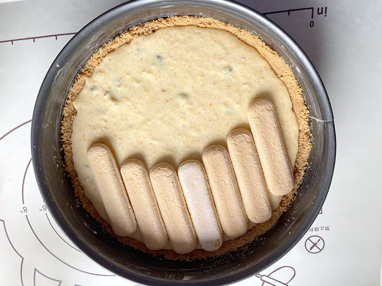 Ugotowane pomarańcze wraz z połową skórek i syropem zmiksować na pure. Dodać jogurt, jaja, creme Fraiche, mascarpone, rodzynki i mielone migdały, dobrze wszystko wymieszać. Żółtka rozrobić z płaską łyżką mąki ziemniaczanej i również wymieszać z powstałą już masą. Ilość pure pomarańczowego dopasuj do rodzaju i wielkości twojej formy i wysokości brzegów, które utworzyłaś z okruchów. Masa nie może zalewać brzegów, zostaw 5 mm od góry na biszkopty. Na koniec ułóż biszkopty tak, aby przykrywały tylko masę i lekko wciśnij, aby się zanurzyły nieco w niej. Jeśli uważasz, że masa jest za gęsta dolej mleka kondensowanego.