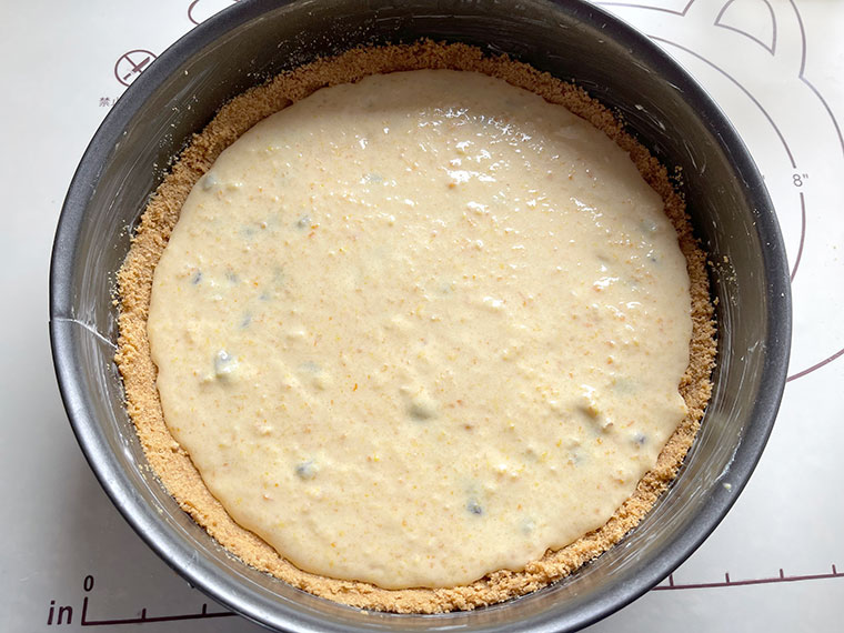 Herbatniki pokruszyć, zmielić i zalać lekko roztopionym masłem. Wymieszać na mokry piasek, formę na dnie wyłożyć papierem do pieczenia i następnie wyłożyć, uciskając dno i boki powstałymi okruchami. Wstawić formę do lodówki.