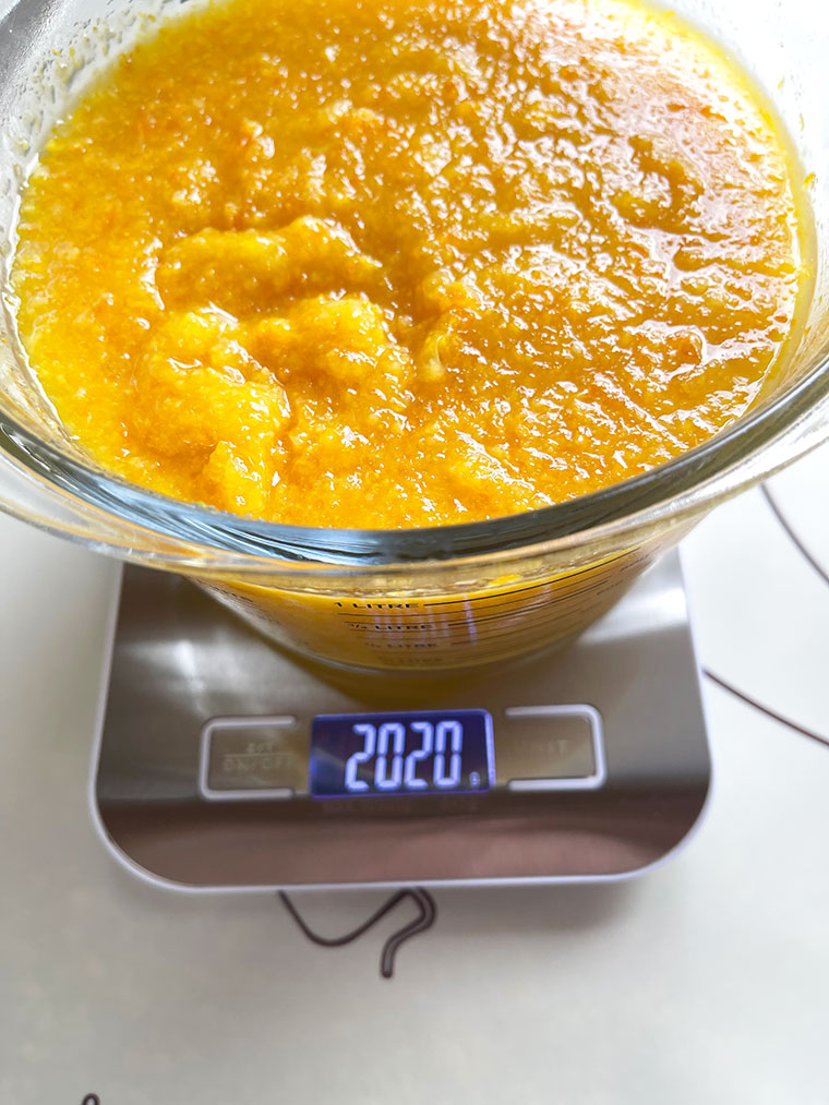 Pomarańcze dobrze wymyć, pokroić w plastry, wrzucić do rondla z 1 litrem wody, zasypać cukrem 60 g i gotować na wolnym ogniu 25 minut, po czym ostudzić. Połowę skórek z pomarańczy oddzielić i odłożyć, można je również pokroić w kostkę, wrzucić do słoiczka małego, zalać syropem, który się wytworzył i odstawić do innych wypieków.