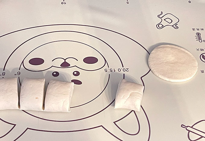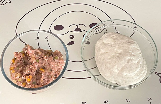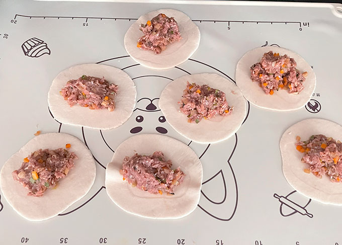 Uformuj wyrośnięte ciasto w wałek i podziel je na 7 równych części. Rozwałkuj każdy kawałek na okrąg cienko, ale nie za cienko. Na środek nałóż trochę nadzienia. Wymieszaj mąkę ziemniaczaną z wodą i posmaruj nią brzegi krążków ciasta. Dokładnie dociśnij (ozdobnie najlepiej)brzegi, aby je skleić.