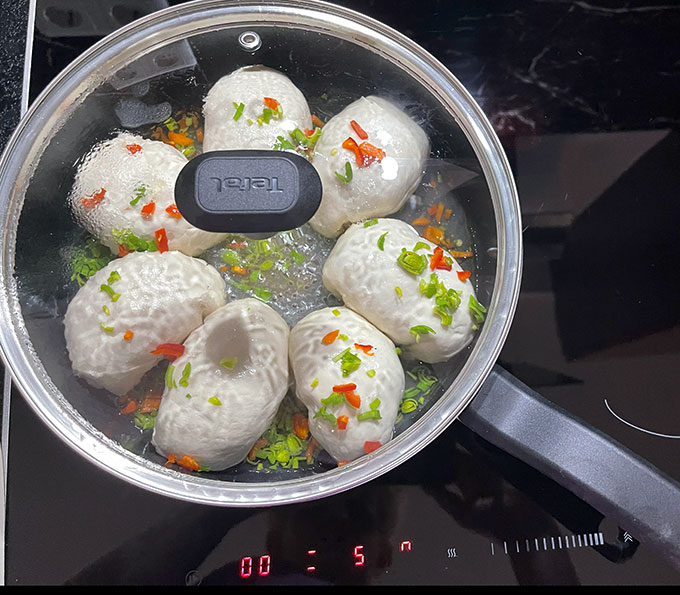 Następnie dolej trochę wody na patelnię, aby przykryła dno i doprowadź do wrzenia na małym ogniu. Poczekaj, aż woda odparuje, a pierogi wyrosną.