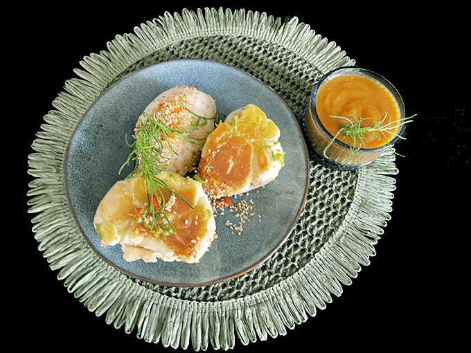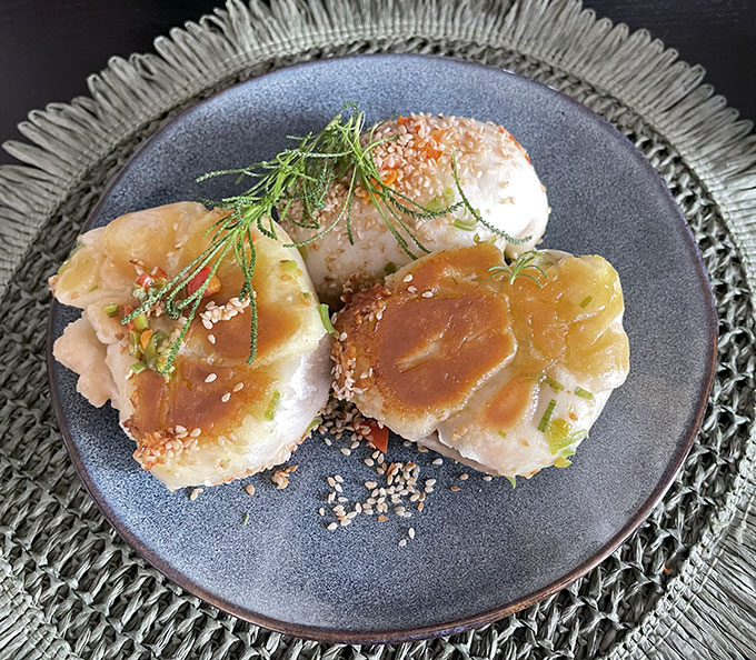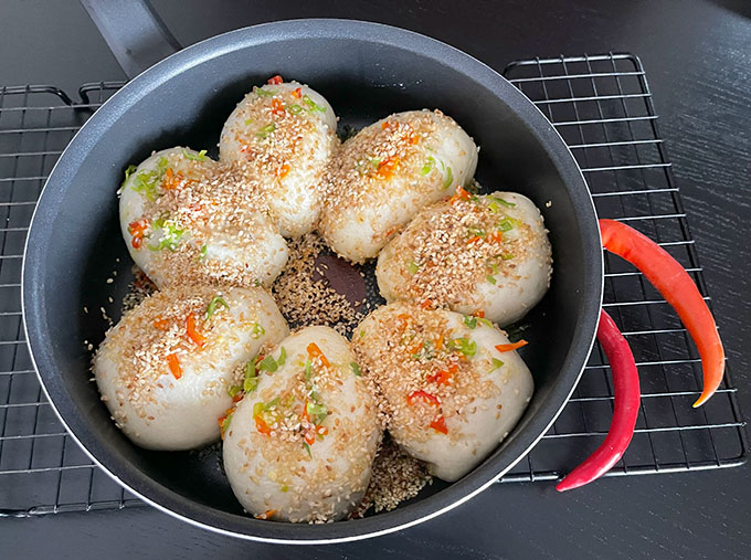 Zdejmij pokrywkę, posyp pierogi sezamem i chili drobno pokrojoną, wlej olej i smaż powoli, aż spód będzie złocistobrązowy i chrupiący. Ostrożnie przełóż pierogi na talerz i podawaj natychmiast z przecierem – sosem warzywnym.
