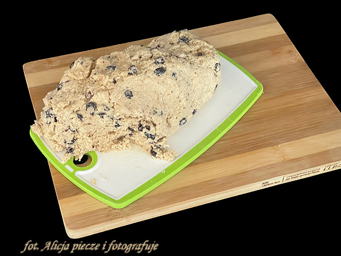 Dodaj suche składniki i kontynuuj mieszanie na niskich obrotach, aż się połączą, a następnie wmieszaj rodzynki.